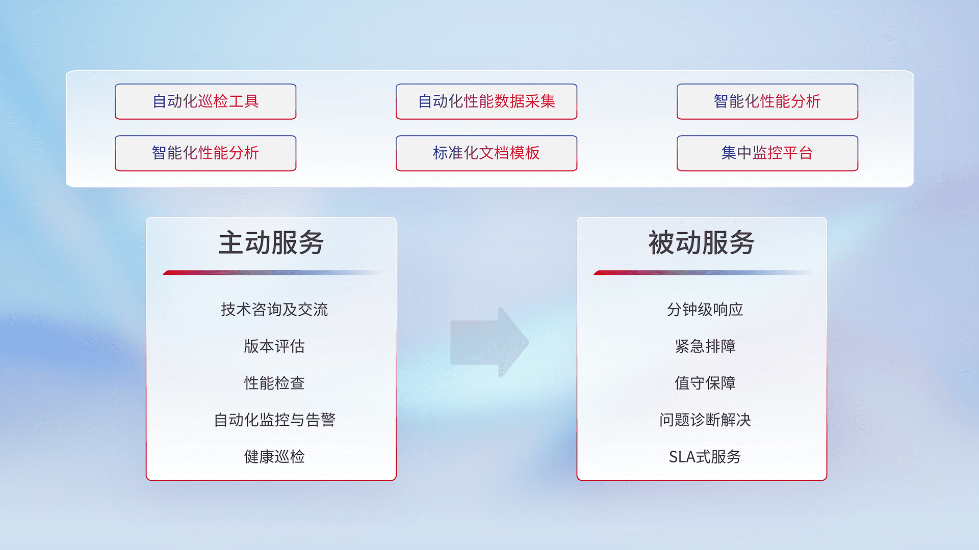 智能化工具和标准化文档,,保障服务质量,,,,提供主动服务(包含技术咨询、、、版本评估、、性能检查、、、自动化监控与告警、、健康巡检)和被动服务包含(分钟级响应、、、紧急排障、、、值守保障、、、、问题诊断解决、、、、SLA服务)。。
